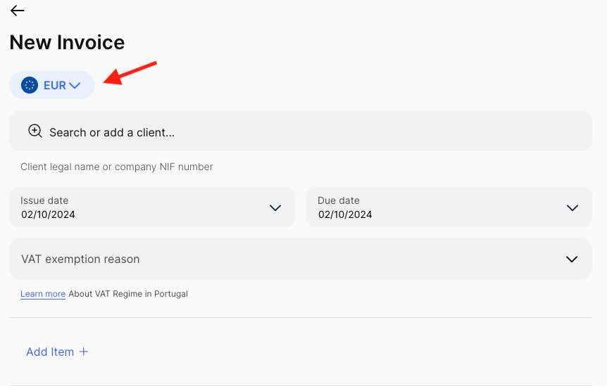 You can issue invoices in various currencies by selecting your preferred option in the "Currency" field. Enter the invoice amount in euros, and the total will automatically display in both euros and your chosen currency.
